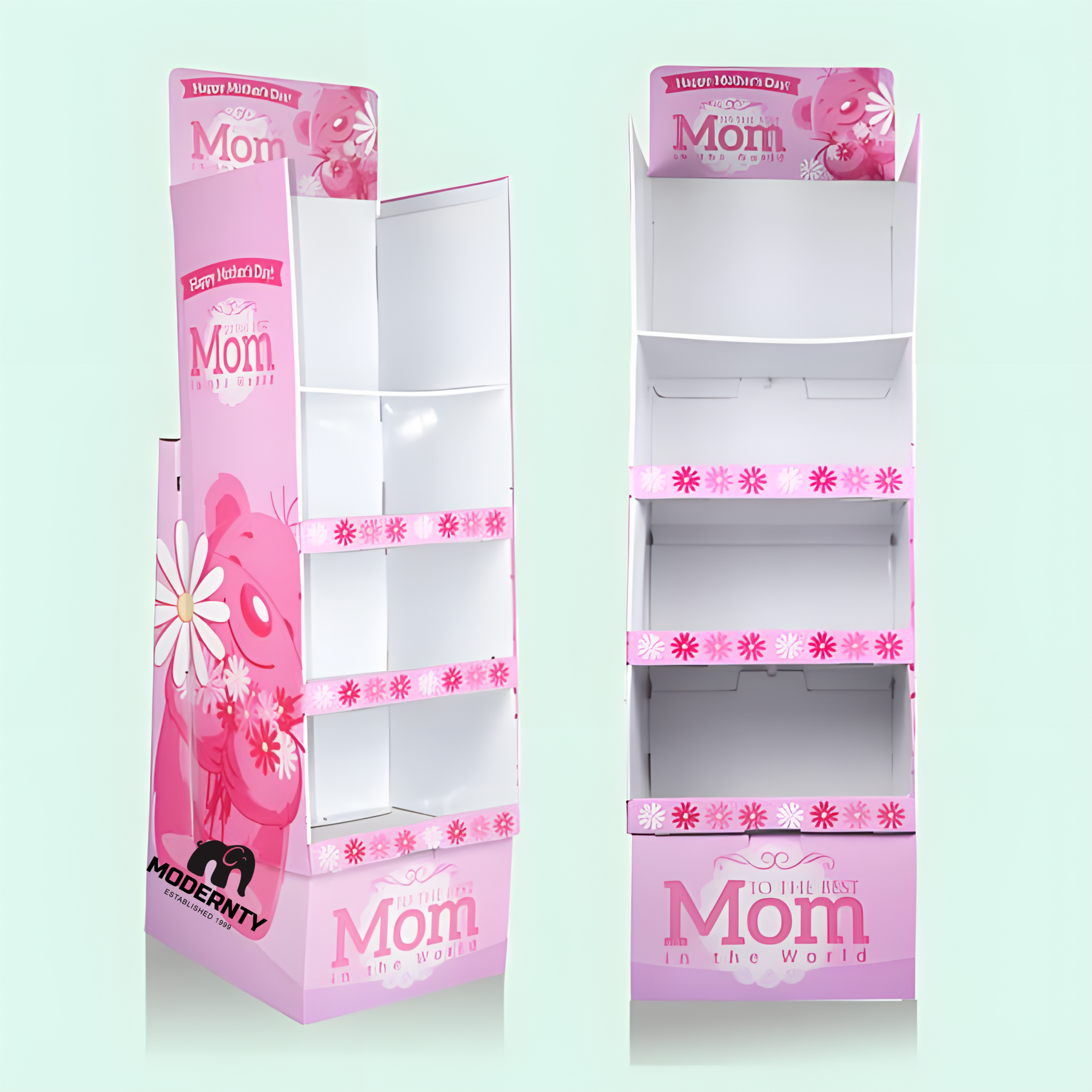 The custom Mother’s Day displays are made with corrugated cardboard material, which is recycled 100% and it is very light-weight. One of the advantages is the cardboard displays will be easier and much more convenient for the supermarkets employees to move, another advantage is when we ship to you or you ship to your retailers the shipping cost will be much cheaper!